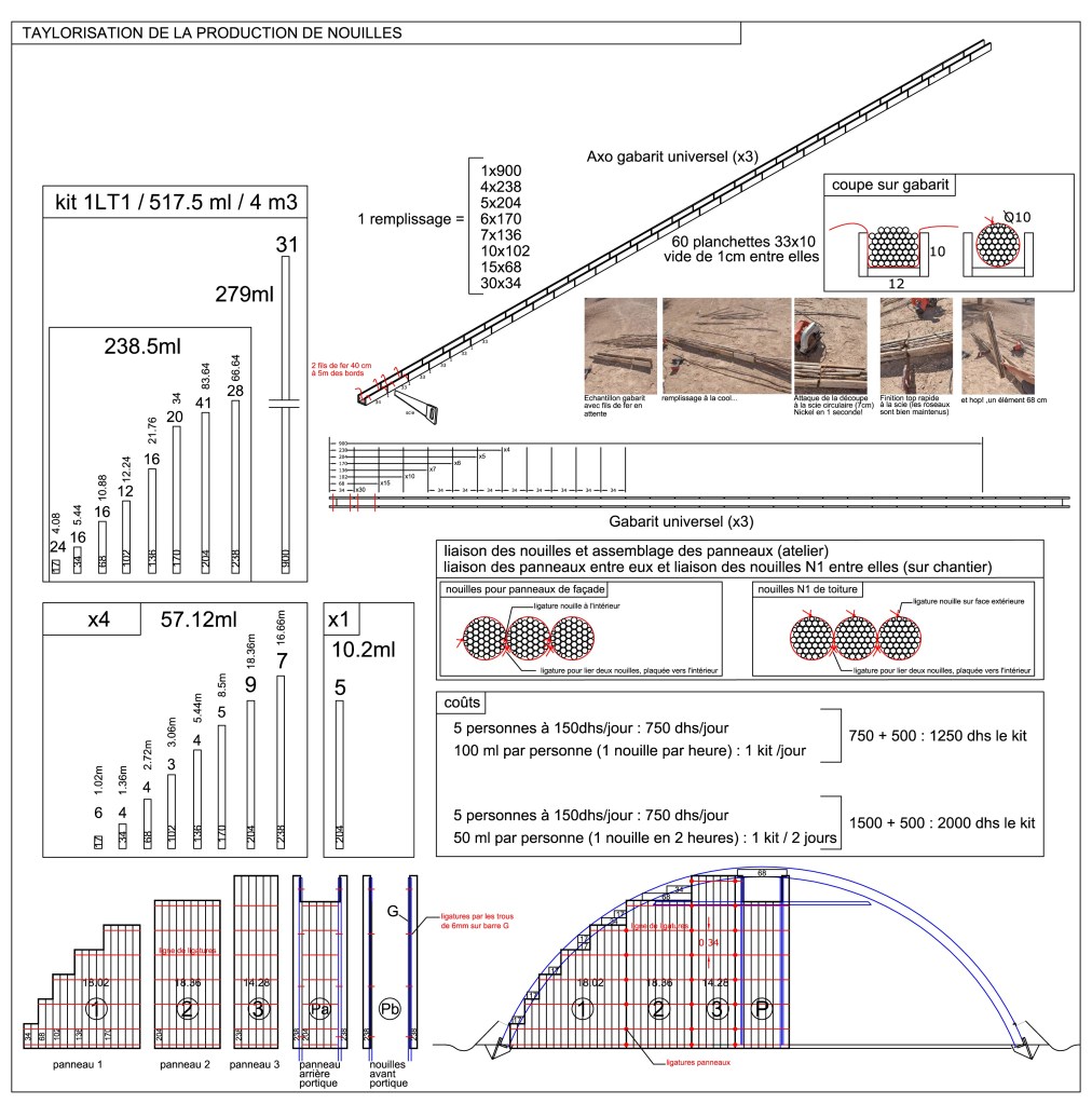 La préfabrication des éléments en roseau, servant d’isolation thermique répartie de la toiture (la voûte) et des parois verticales, peut être optimisée grâce à l’utilisation d’un gabarit développé spécifiquement. Ce gabarit permet à des personnes peu habituées au maniement du roseau de faire des « nouilles » de bonne qualité. Surtout, il facilite le travail, optimisant ainsi la consommation de matière première et le temps consacrés.