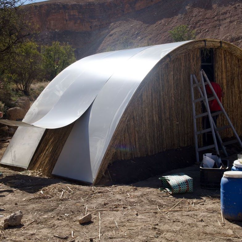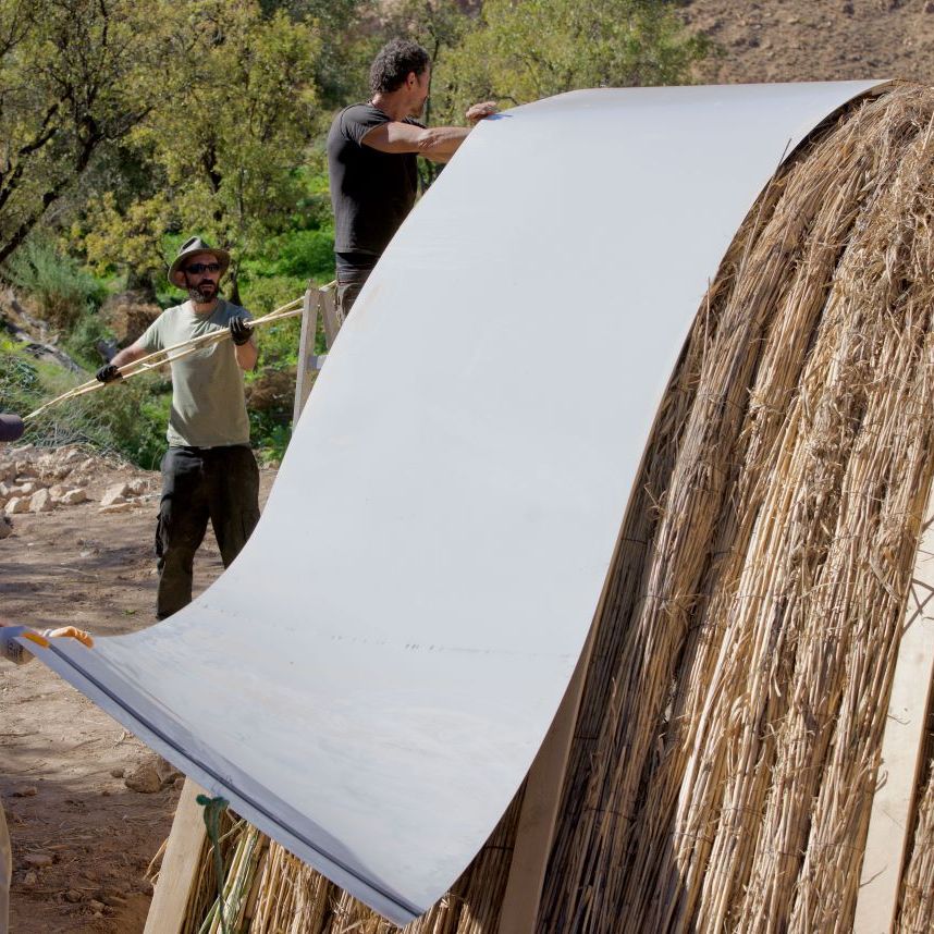 La pose se fait en tirant, grâce à une corde, et déroulant chaque tôle par dessus les guides G1. Une personne tire d’un côté, deux personnes déroulent de l’autre et une autre guide la tôle, les manches à balais facilitant le roulement de la tôle sur les guides en bois. Si les tôles font 122 cm de large, le recouvrement entre deux bandes devrait être de 18 cm (p. 11 du Manuel de montage).