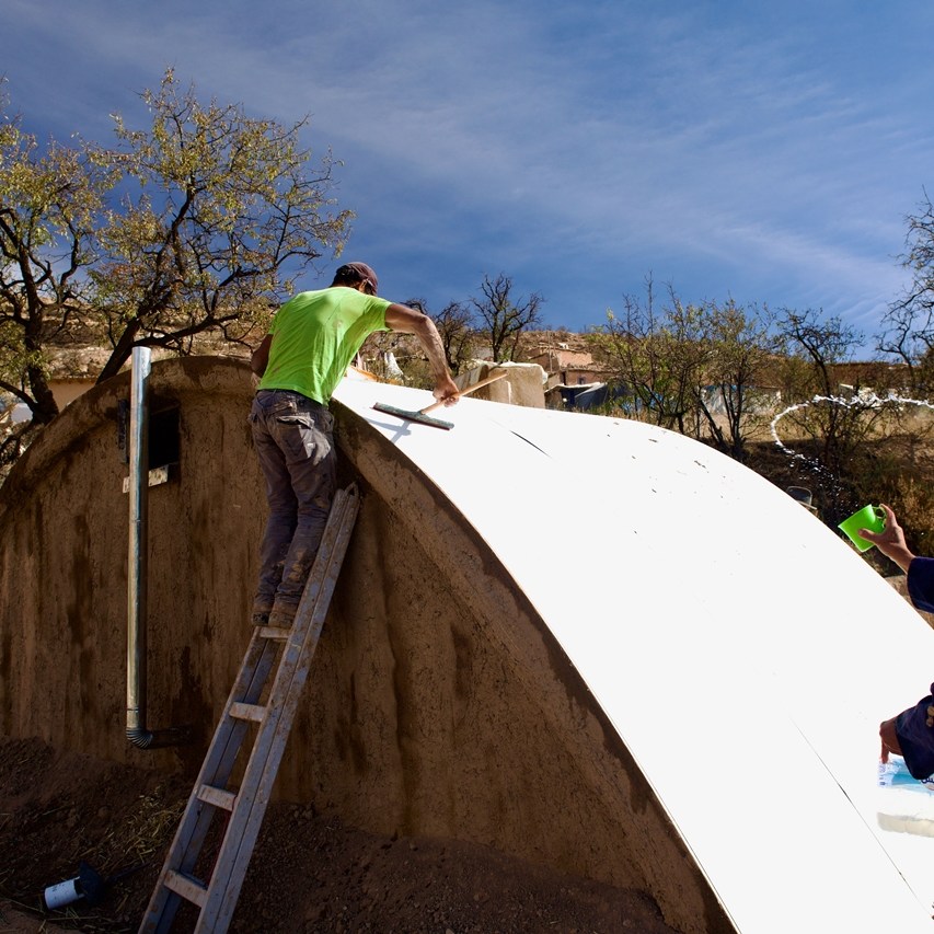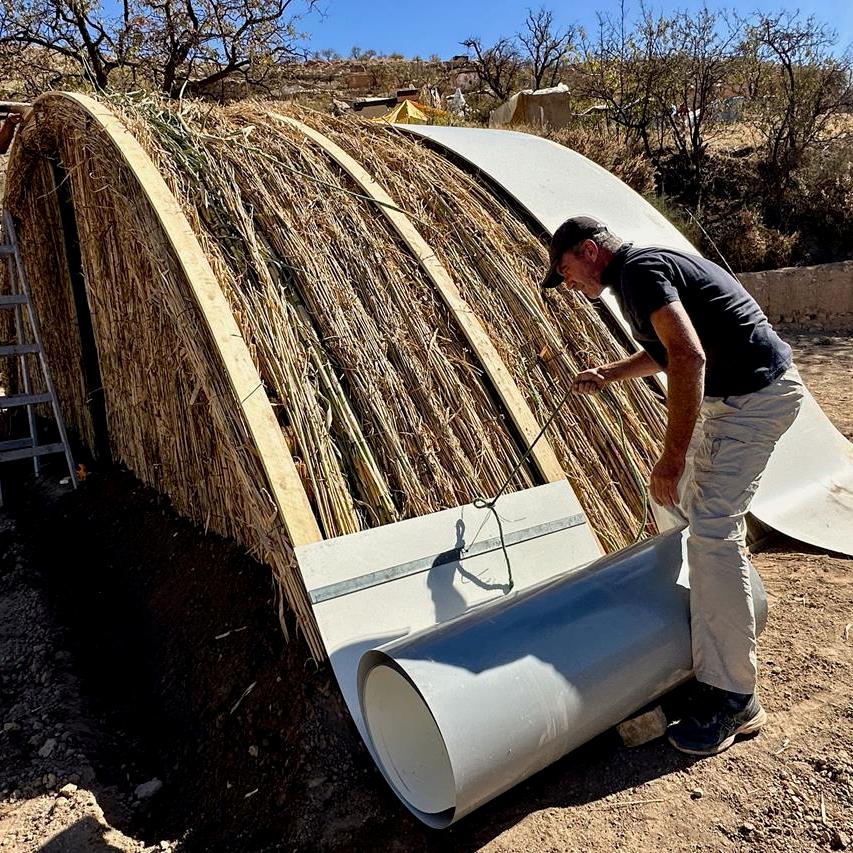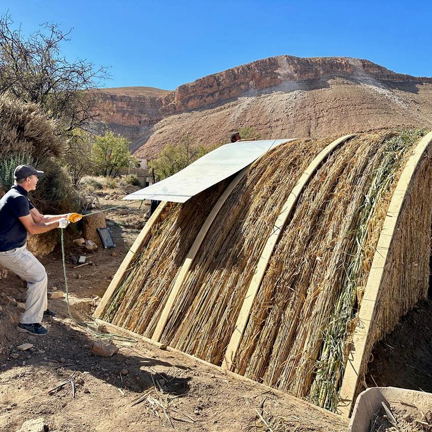 Fixer les gouttières en pied de tôles, de chaque côté, par dessous. Leur donner un angle permettant un bon écoulement de l’eau (y verser de l’eau pour vérifier la pente). Ces gouttières doivent rejeter l’eau vers la séguia périphérique.