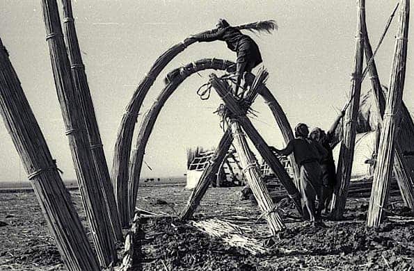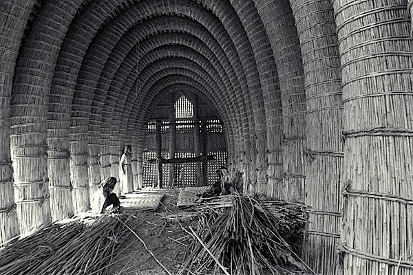 Ces logements temporaires sont principalement construits à base de roseau, plante locale abondante le long des oueds, historiquement utilisée dans l’habitat. A l’image des mudhifs, habitats traditionnels des zones humides d’Irak, ou des anciennes huttes marocaines des plaines alluviales, le roseau sert à la fois d’élément structurel et d’enveloppe thermique.