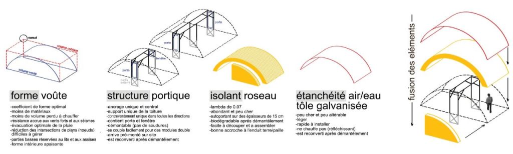 Les modules développés dans ce projet se veulent antisismiques, légers, isolés thermiquement et phoniquement, étanches à la pluie et à la neige, assemblables en une journée, démontable en quelques heures, compostables (roseau, bois), valorisables (acier, tôles, verre), ne comprenant ni béton de ciment, ni plastique… le tout à faible coût (6000 – 7000 DH pour le LT1 de base de 20 m²).